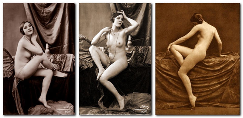 Рисунок 11. Фотографии (открытки) студии «PC Paris». Фотомодель — Жанна Жюйя Головоломка под названием «Старые эротические фотографии» Общеизвестно, что идентификация старых фотографий затруднительна. Но выяснение времени создания и авторства (фотограф? фотомодель?) старых эротических фотографий представляет настоящую головоломку. В небольшой, но весьма интересной книге «Магнаты индустрии. Коммерческая фотография в Париже, 1848-1871» Э. А. МакКоулей [45] рассматривает вопрос, что означало быть коммерческим фотографом в Париже, в конце 19 века и, в частности, заниматься изготовлением эротических фотографий. Деятельность студий, изготовлявших открытки-фотографии в стиле ню, находилась под неусыпным надзором полиции, ревностно следившей за тем, чтобы фотографы «не слишком углублялись в тему». В свою очередь, фотографами были выработаны методы, позволявшие противостоять натиску цензуры [45]: «Нанимая посредников для распечатки негативов, ручного раскрашивания и монтажа изображений, предприимчивые порнографы могли получать максимальную прибыль от ограниченного числа контактов [фотосессий, съемок] с обнаженной моделью, скрывая свое производство от полиции. [Из-за] трудностей определения фотографического стиля, разделения труда и использования одной и той же модели разными фотографами, определение уголовной ответственности за изготовление порнографических фотографий становилось почти невозможным...» Анализируемый в [45] материал относится к 50-70 годам 19 ст. К 1930 году (за последующие 60-80 лет) методы противостояния были доведены до совершенства. Подборка эротических фотографий Жанны Жюйя тому свидетельство. В ней есть все, о чем говорится в цитате: